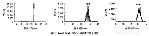 在应用GC—MS法同时测定6种邻苯二甲酸酯含量过程中。发现增塑剂DINP、DIDP定量有一定的特殊性.从图2的色谱图可以看到,增塑剂中的DBP、BBP、DEHP色谱峰分离比较完全,可以很准确地根据特征离子的峰面积进行定量分析.但DINP、DIDP两种邻苯二甲酸酯类增塑剂有大量的同分异构体存在,沸点较高,沸程也较宽,在试验中无论采取如何优化分离方法都不能得到单一的色谱峰,而是一组色谱峰群,且两者的色谱峰有部分重合,得到的峰信号相应也较其他4种低.另外,DNOP的沸点介于DINP、DIDP两种邻苯二甲酸酯之间,出峰时间与DINP、DIDP重叠,很难用SIM选择离子检测法,同时测定6种邻苯二甲酸酯的含量,也大大影响了测定的准确度.通过观察6种邻苯二甲酸酯的质谱图,发现由于它们的结构相似。质谱碎片相似,标准中提到的DNOP、DINP、DIDP3种邻苯二甲酸酯的定量离子279、293、307虽然不是灵敏度最高的质谱碎片,但都具有一定特征性的碎片,用这些离子提取色谱峰可以排除其他峰的干扰.因此,在定量中只有通过SCAN全扫描方式得到总离子流图,然后提取相应的特征离子峰279、293、307才能进行准确地定量.由表2中相应数据可以得出,通过这种方法定量,三者的线性关系较好.这三种邻苯二甲酸酯的特征离子色谱图见图5.对于DINP、DIDP的色谱峰群定量时可用各自的异构体化合物峰面积和进行定量.