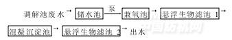 用延时继电器控制提升泵,将调节池废水泵入储水池,不同时间段的废水在储水池内均匀水质水量后,提升至脉冲布水器。脉冲布水器储存3~5min的水量后,瞬间布入兼氧池(A)底部,在兼氧池内通过厌氧菌及兼氧菌水解酸化作用,将废水中的不溶性颗粒分解为可溶解的物质,使难降解的大分子物质分解为小分子物质,从而提高水体的可生化性,为后续好氧处理奠定基础。与此同时,破坏了染料的发色基团,降低废水的色度。兼氧池出水溢流到悬浮生物滤池1(O1),在本单元,填料与充氧污水充分接触,利用生物膜上微生物的新陈代谢作用,将污水中的有机物去除。出水经混凝沉淀去除废水中剩余的部分COD和大部分色度,再经悬浮生物滤池2(O2)降解残留的可生化有机物。