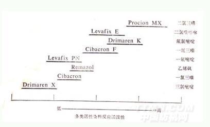 活泼染料的反应性通常是指染料与纤维羟基反应能力的强弱,反应性强的染料在室温、弱碱的条件下即完成固着,但这反应性强的染料稳定性相对较差,容易被水解失去染色能力。反应性弱的染料需要在较高的温度条件下与纤维素键合,或使用强碱剂活化纤维素的羟基,促使染料反应固着在纤维上。