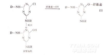 (一)酯键结合的活性染料 以氯代均三嗪为代表的X型和K型活性染料,以及书氟氯嘧啶(Drimarene K、Levafix EA)活性染料均属此类。在印染过程中,染料和纤维素之间是通过亲核取代反应,最终生成纤维素酯。