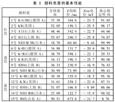 从红、黄、蓝三色系中分别选取5只颜料浆,测定其含固量。稀释相同倍数,测定各颜料浆的Z均粒径,Zeta电位和离心稳定性,结果见表1。