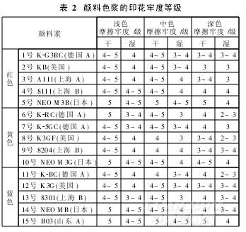 采用不同颜料浆用量分别进行浅色、中色和深色印花,将印花织物置于标准大气平衡箱中,放置4h后取出,测试干湿摩擦牢度,结果见表2。