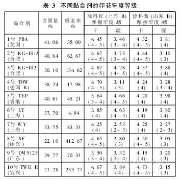 将同一用量的颜料浆、增稠剂与不同种类黏合剂配成涂料印花浆,进行印花、烘干和焙烘处理。印花织物的干湿摩擦牢度评级见表3。表3数据说明,由于黏合剂合成时,所选用单体的种类、结构和配比均不相同,黏合剂产品种类和性能差别较大。如有的黏合剂含固量高达40%,而有的含固量只有20%。吸水率差异更为明显,6号黏合剂LT吸水率最低,仅为4.94%,而8号黏合剂XF吸水率可高达412.67%。