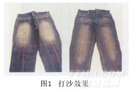 用高压喷枪,将沙粒喷射到牛仔裤的表面,造成裤身局部磨损泛白的效果(图1)。