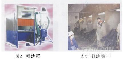 早期的打沙方式是操作者手持喷沙枪将沙喷向需要打沙的裤身部位。由于“打沙”的沙尘污染非常严重,为了加强生产安全保护,打沙操作者需要带上头罩和穿上防护服,有条件的厂家还需设立半密封的喷沙工作间,防止沙尘到处飞扬。打沙的设备及操作示范如图2和图3所示。