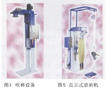 采用刷子摩擦的刷擦法,在整条裤面进行大范围的摩擦,适合前腿位、膝盖处、后臀部等较大面积的“马骝洗”。这种后整理方式一般会先用设备将裤子吹胀并固定,吹裤设备如图4所示。用刷子或磨轮直接在面料的表面进行打磨处理,使衣物表面达到局部磨白的效果,然后再用手工修整裤缝边缘、袋口边、裤脚的折边处等细小的部位,以期达到特殊的效果。