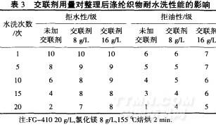 从表3可以看出,随水洗次数的增加,未添加交联剂整理的织物拒水拒油效果下降很快.而添加交联剂整理的织物尽管初始拒水拒油效果与未添加交联剂整理的织物基本相同,但耐洗性得到明显改善.水洗20次后,添加交联剂的织物仍可保持较优的拒水拒油性能,尤其是交联剂用量为16g/L,整理后织物拒水性仍可达8级,拒油性也可达5级.原因是交联剂两端的反应性基团可分别与纤维和整理剂反应,将纤维与整理剂牢固地结合起来,在纤维上形成三维网状结构,增加了纤维分子间滑移的摩擦阻力,减少了水洗过程中纤维表面整理剂的洗除.[5]综合考虑,选择交联剂用量16g/L.