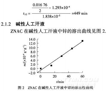 由Origin6.0软件得溶出速率方程及相关性系数为:m=1.838x10-5t+1.293x10-4,R=0.973,t1/2=449min.相关性系数R越接近1,线性越好.结果表明:脚水中的锌含量与洗涤时间有良好的线性关系,说明采用本方法来研究锌基纳米整理布的耐久性问题是可行的.