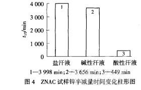 由图4可以看出,同一试样在不同汗液中的t1/2差异性很大:盐汗液(pH≈8)>碱性汗液(pH≈8)>>酸性汗液(pH≈3).锌基纳米纯棉织物耐酸性较差,tl/2不足450min;但耐盐性和耐碱性较强,t1/2超过3000min.