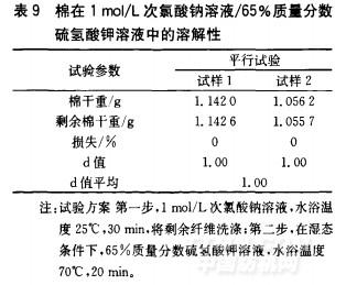 从表9可以看出棉在1mol/L次氯酸钠溶液/65%质量分数硫氢酸钾溶液中几乎没有损伤,修正系数为1.00。