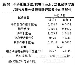 根据牛奶蛋白纤维在各种试剂中的溶解性,经反复试验。笔者选用1mol/L次氯酸钠溶液/65%质量分数硫氢酸钾溶液测定牛奶蛋白纤维/棉中各组分含量。棉在lmol/L。次氯酸钠溶液/65%质量分数硫氢酸钾溶液的溶解情况如表9所示。