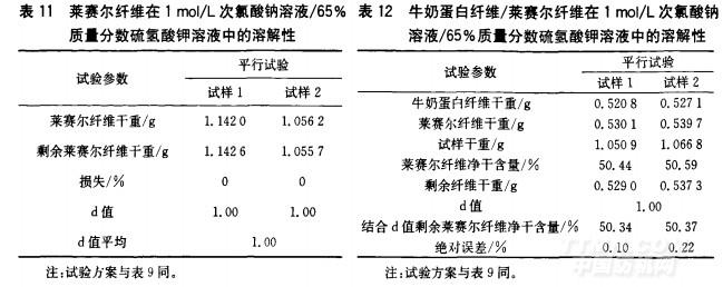 根据牛奶蛋白纤维在各种试剂中的溶解性,经反复试验,笔者用1mol/L。次氯酸钠溶液/65%质量分数硫氢酸钾溶液测定牛奶蛋白纤维/莱赛尔纤维中各组分含量。莱赛尔纤维在lmol/L。次氯酸钠溶液/65%质量分数硫氢酸钾溶液中的溶解情况如表ll所示。