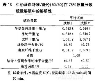 牛奶蛋白纤维在50℃的75%质量分数的硫酸溶液中能完全溶解,75%质量分数的硫酸溶液对涤纶几乎没有损伤,修正系数为1.00[5]。笔者做了牛奶蛋白纤维和涤纶纤维混合物的测试。结果表明,可以用国家标准-列中涤纶和棉、粘胶纤维的方法来分析牛奶蛋白纤维的含量。牛奶蛋白纤维、涤纶在硫酸溶液中的溶解性如表13。