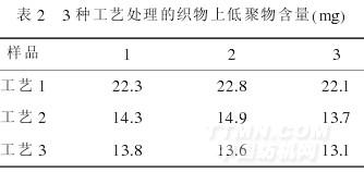从表2可以看出,工艺3处理的织物上低聚物含量最低,工艺1处理的织物上低聚物含量最高,工艺2处理的织物上低聚物含量稍低于工艺3处理的织物。这是因为,在工艺2中加入了低聚物去除剂,在染色的过程中,低聚物去除剂渗透到纤维内部,将纤维内的低聚物溶解并扩散到纤维表面,加上染色过程中染液的不断搅动,纤维表面的低聚物很容易扩散到染液中。所以,工艺2处理的织物低聚物含量明显低于工艺1处理的织物,而工艺3又是在工艺2的基础上,将织物进行还原清洗,在这个过程中进一步将织物上少量的残存低聚物去除,工艺3处理的织物低聚物含量最低。
