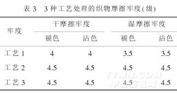 参照GB/T3920-1997,将处理好的涤纶织物试样进行测试,用灰色样卡评定摩擦位置的摩擦褪色级数,用沾色用灰色样卡评定摩擦布的沾色级数,结果见表3。