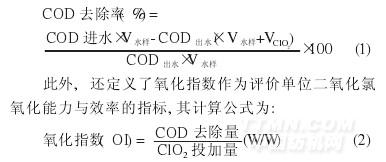 针对难降解废水及本实验废水浓度高、可生化性差等特点,二氧化氯催化氧化技术将首先着眼于污染物浓度的削减,本文中采用COD去除率作为评价氧化处理效果的主要指标。考虑氧化剂带入的体积,计算公式如下: