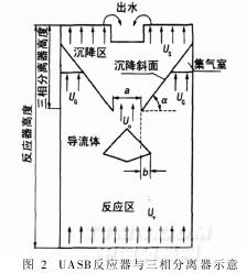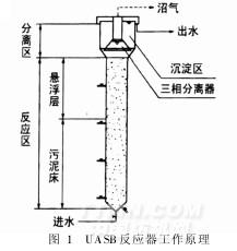 UASB反应器由反应区和沉降区两部分组成。反应区又可根据污泥的情况分为污泥悬浮层和污泥床区。污泥床主要由沉降性能良好的厌氧污泥组成,SS浓度可达50~100g/L或更高。污泥悬浮层主要靠反应过程中产生的气体的上升搅拌作用形成,污泥浓度较低,SS一般在5~40g/L。在反应器上部设有气、固、液三相分离器。