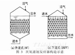 厌氧生物滤池按水流方向可分为升流式和下流式两种。废水向上流动,通过反应器的厌氧滤池称为升流式厌氧滤池;水流自上往下流动的反应器称为下流式厌氧滤池。两种反应器构造