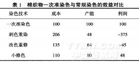 染色即染上颜色,也称上色,是指用化学的或其他的方法影响物质本身而使其着色.一次准染色是要有效地控制每一批纺织品的染色生产过程,一次性满足客户的质量和数量要求或不需要采取任何回修措施.它对印染行业发展低碳经济具有积极作用,是一条适应低碳经济要求的重要途径,特别是原棉来源不同、质量参差不齐,棉织物染色时会产生许多不确定的因素,使染色成功率降低,因此,抓住一次准染色,不断改进企业的经营和管理会对企业的节能、减排、降污、环保、增效产生很大的效果.大量的生产实践证明,一次准染色与常规染色(即非一次准染色)在生产成本、产能和利润等方面相比有明显的差别,如表1所示.