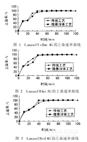 根据各自的最佳工艺条件,上述三种染料分别按传统染色工艺和微悬浮体染色工艺对羊毛纤维进行染色,两种工艺下的上染速率曲线如图1~3所示。