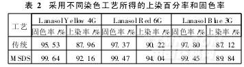 分别采用传统染色工艺和微悬浮体染色工艺在各自最佳工艺条件下对羊毛纤维进行染色,测定其上染百分率和固色率,结果如表2所示。