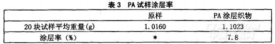 涂层率是单位面积涂层织物上的涂层剂重量与涂层织物重量的比值,从以上的测试结果,我们可以认为,经涂层整理的试样,其涂层前重量为相同面积(用能裁剪面积为100cm2的圆形试样的裁剪器取样,以保证涂层织物与原样的样品面积相同)原样的重量,从而得出单位面积涂层织物上涂层剂的量,再计算出涂层率。用裁剪器分别裁取l00cm2原样、PA试样各20块,测其平均重量,再计算涂层率,结果如表3所示。