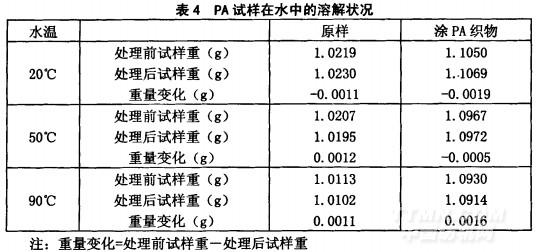 从表4中看出,经蒸馏水处理的样品,织物重量几乎无变化,说明蒸馏水并不能去除PA织物上的涂层剂。