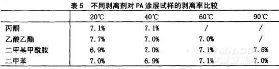 不同溶剂在不同温度下对PA涂层试样的剥离率比较如表5所示。