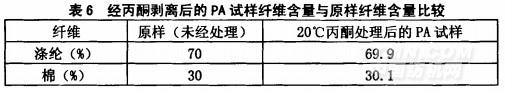 为了验证本文所设定的试验条件是否对试样的纤维含量测试有影响,我们依据GB/T2910一1997《纺织品二组分纤维混纺产品定量化学分析方法》,对经丙酮剥离后的PA试样进行成份定量测试,将测试结果与未经涂层整理的原样的定量测试结果进行比较,见表6。