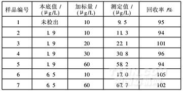(2)方法的检出限0.59ug/L,回收率94%~105%,标准曲线在0~72ug/L浓度范围内特征浓度为0.94~1.12ug/L。