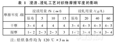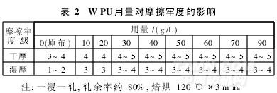 由表1可以看出,采用浸轧工艺处理的染色布,其湿摩擦牢度要高于采用浸渍工艺。采用浸渍整理的染色布,湿摩擦牢度最高只有3级,而采用浸轧工艺可以达到3~4级。其原因是,湿摩擦牢度提升剂WPU呈弱阳离子性,在浸渍过程中与纤维素阴离子的吸附力不强,当用量很少时,不能在纤维表面形成连续的膜,因此湿摩擦牢度相对比较低;要想达到较好的效果,只有增加WPU的用量。因此,以下试验均采用浸轧法。