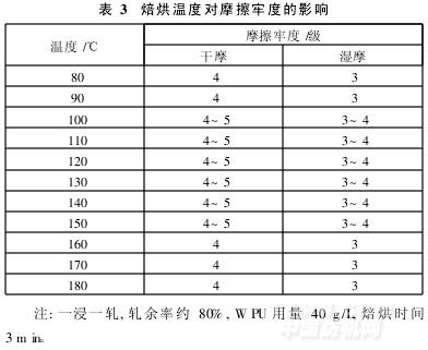WPU必须在合适温度下焙烘一定的时间,才能生成完整、致密的膜结构。时间太短,WPU大分子无法完全解封闭,或者无法完全与纤维素纤维的—OH、染料上的—OH、—NH2发生反应,导致湿摩擦牢度提高较少。