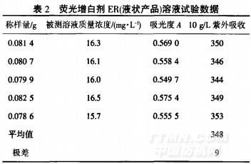 通常用于纺织印染行业的荧光增白剂ER产品有液状和粉状(配有分散剂等助剂),其紫外吸收约为荧光增白剂ER(原粉)的1/5,荧光增白剂ER(液状产品)溶液数据见表2.