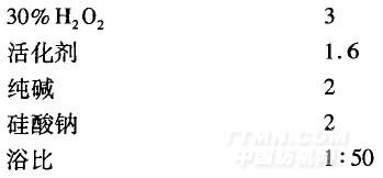 双氧水漂白工艺由于其稳定性好、污染小、处理时间短、白度高、不泛黄以及对环境污染小等优点,广泛应用于棉、涤棉、丝绸、麻等的漂白。但双氧水漂白在实际应用中也存在着一定的问题,例如,双氧水汽蒸(或蒸煮)工艺,需在高温处理下长达约1h才能完成漂白作用,不仅能耗高,并且对纤维有一定的损伤,织物断裂强力下降。此外,双氧水冷轧堆工艺堆置时间长,环境温度和洗涤条件等对漂白效果的影响较大,过氧化氢不稳定,容易分解,从而降低其利用率。为此,染整工作者致力于新的漂白体系的研究,要求既无AOX污染,又具有低温漂白能力,以期取代传统工艺。近年来,双氧水/活化剂低温漂白工艺倍受关注,