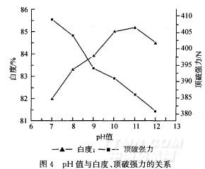 对pH值进行单因素分析。双氧水用量12mI/L,渗透剂2g/I,精练剂2g/L,硅酸钠3g/L,pH值7~12,温度80℃,碳酸钠1.5g/L。时间50min,浴比1:30。其白度和顶破强力与时间的关系见图4所示。