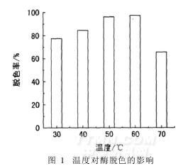 由图1可见,皂洗酶最佳使用温度为50~60℃,超过70℃,酶部分失活, 80℃时酶全部失活,丧失脱色能力。综合考虑脱色效果及能源消耗,确定皂洗酶最佳使用温度为50℃。