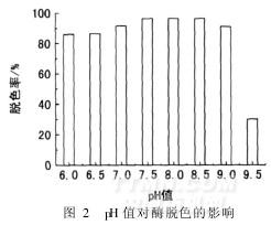 酶对酸碱度非常敏感,故使用时应严格控制pH值。在50℃下,采用皂洗酶用量0. 25 g/L、调节剂AD用量1 g/L、处理15 min的工艺条件,考查不同pH值对酶脱色性能的影响,结果如图2所示。