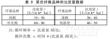 染色时,染液的比流量、循环次数和循环频率相互间具有一定的关系。通过测定比流量数据,可以计算出每分钟循环次数(次/min)。例如浴比1∶8,比流量为30 L/(min·kg),则每分钟循环次数为3~4次(表5)。