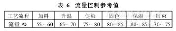 染液采用大流量、高效率及抗气蚀性强的高比转速离心泵,进行强制循环。既可根据染色工艺要求控制染液单向或内外向循环,也可将其设计成离心为主、列管热交换器外置和采用混流的三位一体形式;使其既具有混流泵吸口流量大特点,又具有离心泵出口扬程大的优点。主循环泵变频调速,通过内外压差检测反馈信号,调节主泵转速,对循环染液进行流量控制,以满足不同纱线品种及用途的要求,从而提高筒子纱染色的匀染性和染色质量。依托先进的染整设备,可以在受控情况下实现以最少的流量进行优质、低耗的筒纱染色。若设计流量为100%,染色各阶段的流量控制参考值见表6。