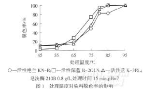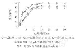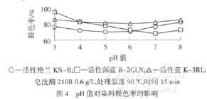 由图1可知,温度较低时,皂洗酶210B对3只活性染料几乎没有脱色作用;65℃左右时,皂洗酶210B开始对染料起脱色作用.随处理温度的升高,脱色作用逐渐增强,且80℃时,蓝色的染料溶液基本变为淡黄色;仅在较高温度下,皂洗酶的特殊酶基团才能与活性染料的发色官能团充分发生反应,加速染料的氧化分解,活性深蓝B-2GLN和活性蓝K-3RL于85℃脱色较佳,活性艳兰KN-R于95℃脱色较佳.综合考虑,选择90℃对染料脱色.