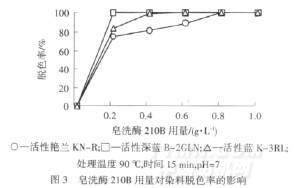由图3可知,活性深蓝B-2GLN、活性蓝K-3RL和活性艳兰KN-R在皂洗酶210B用量分别为0.2、0.4和0.8 g/L时,脱色率达到100%.
