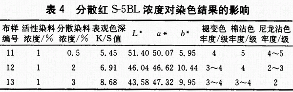 由表4和表3可知,对分散红/活性红一浴二步法染色,随着分散染料浓度的增大,织物K/S值是逐渐增大的,但没有活性染料浓度引起的K/S值变化大,说明分散染料在PLA/棉混纺织物上的提升性没有活性染料的好。从表4中数据还可看出,随着分散染料浓度的增大,几种耐水洗色牢度都有所降低,尤其是尼龙沾色牢度降低更明显,说明分散染料较易从织物上解析下来。对尼龙分散染料有一定的亲和力。