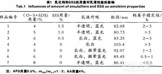 由图1可见,随着SSS用量的增加,粘合剂乳液的粒径先减小,然后增大。当SSS用量大于1%之后,由于聚集在乳胶粒子表面的SSS过多,容易发生自聚,使乳液的水化层增大,从而使得乳液粒径变大,体系的凝聚物也随之增多。