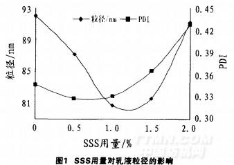 为了研究SSS用量对乳液粒径的影响,本实验中,固定0—5和SDS的用量为5%,改变SSS的用量,测得粘合剂乳液的粒径和粒径分布指数PDI如图1所示。
