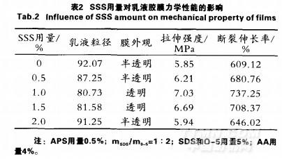 由表2可以看出,适量加入反应性乳化剂SSS可以使乳液胶膜的力学性能有明显的提高。当SSS用量为1%时,胶膜的力学性能最好。这是因为此条件下合成的乳液粒径最小,分子问堆积得最紧密,在外力作用下,其形变最小,所以胶膜的拉伸强度和断裂伸长率均最高。