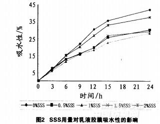 由图2可见,使用反应性乳化单体SSS后,乳液胶膜的吸水性减小。乳液合成中不)]nSSSBI-,制得的乳液表面富集着大量的乳化剂分子,大量乳化剂分子上的亲水基团能够吸附大量的水分子,此外,0—5gn SDS还可以从胶膜中迁移至水相,在胶膜表面留下一些孔隙,这些孔隙又利于水分子的渗透,这2方面的原因导致了仅仅由0—5和SDS合成的乳液胶膜的耐水性较差。然而,反应性乳化单体SSS具有聚合活性,本身也参与了聚合反应并成为聚合物的一部分,在成膜过程中,SSS不随乳液成膜而迁移,减少胶膜对水的吸收,从而可以提高乳液胶膜的耐水性。但是,当SSS用量大于1%后,其耐水性反而降低,这是因为,SSS分子中的强亲水性基团磺酸根使得SSS具有一定的水溶性,在水相中SSS易发生自聚成水溶性低聚物,易使得膜表面产生亲水区域,从而增加了乳液胶膜的吸水性。