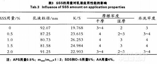 由此可见,SSS的加入对涂料印花各项指标的提高有一定的作用,这也同时证实了乳液的粒径大小影响着粘合剂在涂料印花中的应用。