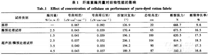 处理条件:超声波40kHz,40℃,浴比1:20,pH=4.5,酶用量分别为1.5%、2.5%、3.5%、4.5%(O.W.f),处理50min,然后将试样晾干,充分调湿后进行柔软整理。结果如表1所示。
