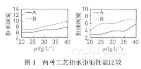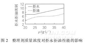 由图2可知,随着整理剂质量浓度的增加,织物的拒水拒油效果增加,当整理剂质量浓度达到40g/L时,拒水级均可达到最高级10级。这时有机氟整理剂在织物表面形成一层低张力的拒水拒油膜,整理剂质量浓度越高,织物表面的有机氟含量越高,其分子堆积越紧密,从而拒水拒油效果增强。