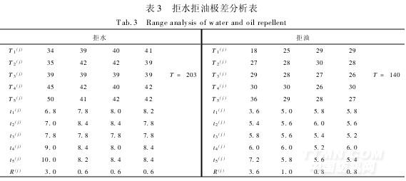 根据正交试验数据,分别计算拒水拒油极差,结果如表3所示。